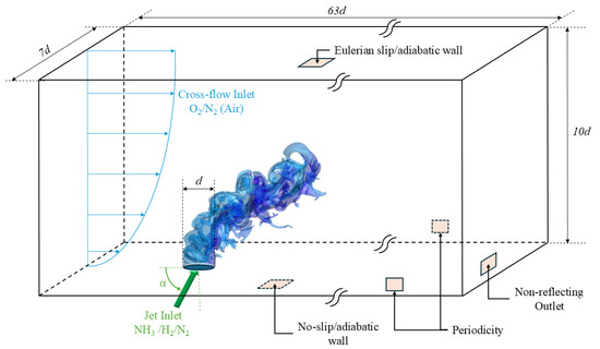At the air crossflow inlet of the computational domain, velocity fluctuations are prescribed: approximately 5% of the average inflow speed. Turbulent speed fluctuations are not introduced at the jet exit [35]; this presumption was already justified in our previous work [10], assuming that turbulence of the crossflow is of greater importance than the jet one. At the bottom wall, located at , is applied a boundary condition of a no-slip adiabatic solid surface. On the contrary, the top wall, located at , is considered adiabatic and Eulerian. The flow is directed out through a non-reflecting outlet, while periodicity is implemented along the spanwise direction. A representation of the boundary conditions is depicted in Figure 3.