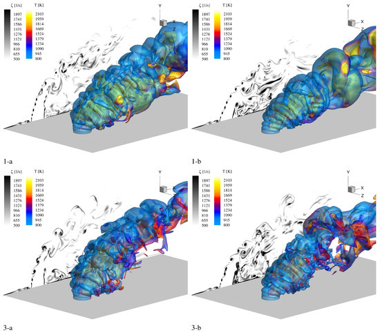The flow fields and their characteristics are presented and discussed in this section. In Figure 4, the NH3 mass fraction iso-surface colored by temperature is depicted as volume rendering for two simulations’ set cases of Table 2 (i.e., Set #1 and Set #3). In the same renderings, a slice with the vorticity magnitude referring to the central longitudinal plane is depicted.