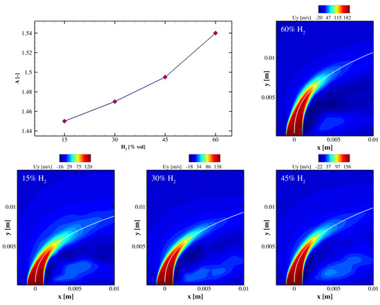 where x and y are the spatial coordinates of the trajectory, J is the momentum flux ratio, d is the jet diameter, and A and B are two constants that account for other relevant physical properties. Numerically, the trajectory is calculated by fitting Equation (2) along the flow field to find the A and B constants, ensuring that the calculated path follows the actual behavior observed in the simulation. The results of Figure 5 present the y-component mean velocity field for all cases, where each contour plot is accompanied by a white solid line representing the estimated jet trajectory. The matching obtained is quite satisfactory in all cases, although Equation (2) was originally designed for non-reacting jets. Indeed, the jet trajectory in non-reacting JICF experiments has been extensively studied and well characterized, while few correlations for reacting jets have been proposed [25,69,70,71,72]. Nevertheless, in some cases, correlations developed for a non-reacting JICF have been successfully applied to predict the trajectory in reacting situations [25,69], while other studies have observed significant deviations [70,71]. In the present cases, the trajectory fitting procedure yells for a fixed value of and a variable value of A with the composition. The fitting results are shown in the largest subplot of Figure 5, which provides a quantitative assessment of the trajectory parameter A. As the hydrogen content increases, parameter A exhibits an ascending trend, reflecting the modification in jet penetration and deflection characteristics due to varying composition.