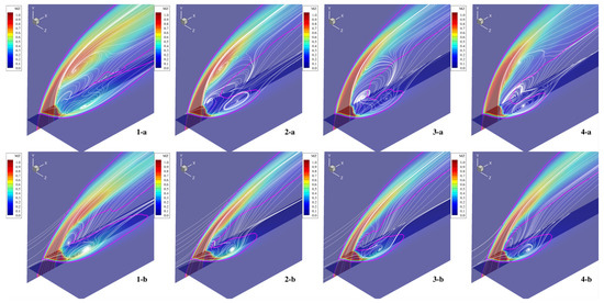 Figure 6 depicts the time-averaged mixture fraction contours on the z = 0 and y = 0.003 m planes; it also reports the stream traces, represented with white solid lines, and the stoichiometric mixture fraction, represented with a solid purple line. The stream traces emphasize the existence of a major recirculation zone that arises on the leeward side for all cases under investigation. This vortical structure has a peculiar shape in the space; indeed, most of the structure is initially aligned with the crosswise direction but, as the flow develops, it curves simultaneously in the streamwise and wall-normal directions, strongly deviating and mixing the incoming fresh air. This shape changes across the cases and seems to be stronger at . Cases 1-a and 4-a show also the presence of a second recirculation bubble above the previous one.