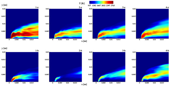 The pattern of the mixture fraction, and its stoichiometric value, in the field give information about the mixing in the zone under inspection. In case 1-a, almost the entire leeward branch has a mixture fraction greater than the stoichiometric value, and the presence of the second recirculation zone further promotes this effect. This is the case that achieves the best mixing and, as observed later, the best combustion performance in terms of temperatures (see Figure 7). In case 1-b, on the other hand, the second recirculation zone is not present but good mixing is obtained overall. By keeping the injection angle constant and increasing the hydrogen content, the situation changes dramatically. At 30% H2, the mixing is greatly reduced (case 2-a) and is strongly driven by the recirculation zones. Moving to 45% (3-a) and then to 60% (4-a), the situation turns out to be similar, with a further decrease of the rich zones in the crosswise direction but an increase in the streamwise one. The same conclusions can be replicated for the 75 cases. In these cases, however, in the z = 0 plane, the recirculation zone turns out to be absent in the crosswise direction, strongly limiting the formation of rich zones only at the shear layer of the jet.