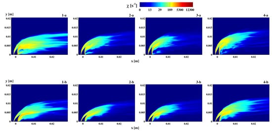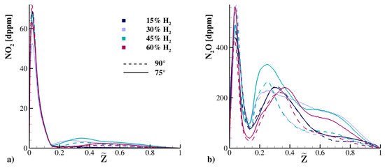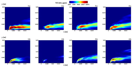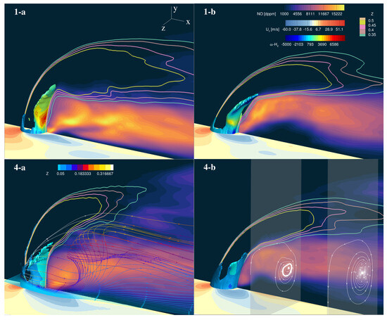 Figure 16 compares flames 1a-b and 4a-b close to the fuel injection, showing the mean NO concentration ([dppm]) and mixture fraction isolines at m, isosurfaces of the scalar dissipation rate = 1250 s−1, and velocity streamtraces in two different plane ( m and m) to highlight how fresh air is transported in the recirculation zone in the two cases 4a-b. It is observed that the is mainly produced in two zones. The first is immediately adjacent to the fuel jet and exhibits high values of the scalar dissipation rate (increasingly higher values as the concentration in the fuel increases) and high values of the mixture fraction. This zone has a greater extent in the mixture fraction space for type b flames. The second zone is located in the recirculation zone downstream of the jet, and it exhibits low scalar dissipation rates ( < 100 s−1) and values closer to the stoichiometric one, resulting in a very-high-temperature region. In general, for all flames, is produced for higher values as the mixture fraction and concentration in the fuel increase. The same trend occurs for the different NO formation paths except for the Zeldovich path, which is negligible for .