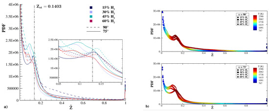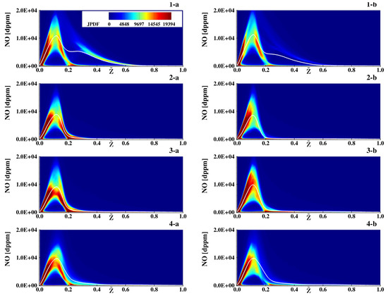 Figure 9a shows the normalized Probability Density Function (PDF) of the Favre filtered mixture fraction, , in the investigated flames. These PDFs show two peaks at and , corresponding to air and fuel streams, and a further peak for Z values below 0.2, with tails extending to . The a-flames have this third peak exactly on the stoichiometric value (the same for all concentrations), apart from those at (); instead, the b-flames, apart from those at that exhibit localized extinctions, have this peak at , with the value decreasing as the hydrogen increases. Flames at and show the presence of rich zones at , with this phenomenon being more pronounced for the 1-a flame. This result is in agreement with the joint-PDFs in Figure 10, where NO is formed also in rich zones of the flame but only for the flames 1a-b and 4a-b (even if in small concentrations). Figure 9b shows the same Probability Density Function colored by the mean temperature: in the simulated flames, the average temperature reaches its maximum for Z values between 0.08 and 0.2, apart from the flames with hydrogen (and to a lesser extent for those with ), for which the maximum temperature region extends up to ( for those with b), well beyond the stoichiometric mixture fraction value.