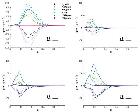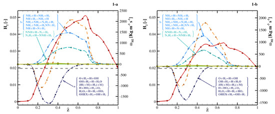 Looking at the set of reactions involving production/destruction, as shown in Figure 15, in cases 1a-b the hydrogen is mainly consumed in regions with (through reactions involving the radicals denominated path-a) and produced at rich conditions with [0.3–0.7], mainly through the reactions involving (path-b), and secondarily by those involving and (path-c). It is stressed that this conversion phenomenon does not depend on the particular chemical mechanism here adopted, as the reactions causing it are present in all the other mechanisms typically used in the literature for ammonia and hydrogen flames with very similar reaction coefficients [43].