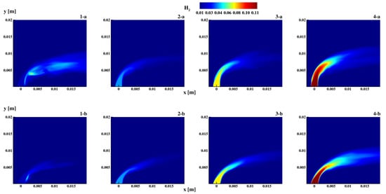 The figure also highlights that the most intense combustion occurs at 15% H2 and (1-a), with a maximum temperature that exceeds 2800 K. At a fixed injection angle, increasing the hydrogen content first leads to a reduction in the combustion intensity (2-a), which, however, increases again for higher values of H2 (3-a and 4-a). A similar trend occurs for , even if the lower injection angle decreases the combustion intensity and the extension of the combustion zone in the wall-parallel direction, giving rise to a spotted concave cold area near the wall. We can readily notice the attempted quenching of case 2-b due to the combination of low injection angle and low hydrogen concentration. Case 1-b exhibits a temperature peak around 2800 K, as for case 1-a, but in this case this zone is confined in the recirculation bubble. The peculiar behavior at 15% H2 can be explained by a more intense hydrogen conversion through ammonia cracking and other formation pathways, which are analyzed in detail in Section 4.3.