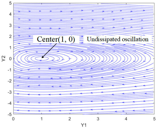 then two eigenvalues are imaginary, i.e., . The equilibrium point is neutral stable and called a center, which means that the point is encircled by a set of closed trajectories in the phase plane. They are neither drawn nor repelled by the center. Rather, they form limit cycles around it. Figure 3 illustrates an example simulation result of a postulated phase diagram satisfying the condition for HMB dynamics.