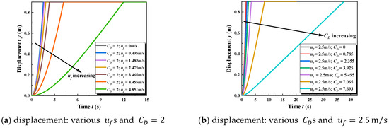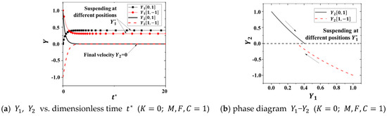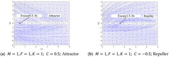 The equilibrium point is then a unique focus. Moreover, when or , the equilibrium point is stable (attractor), which means any displacement deviation of HMB from the equilibrium point will lead to its motion approaching back to the equilibrium; while when or , the equilibrium point is unstable (repeller), which means that once there is some slight disturbance, the HMB suspended at the point will leave away. Two example simulations of phase diagram for the two types of foci with and are illustrated in Figure 4. It should be mentioned that for the simulation conducted here (and also in this Section 3.1), MATLAB(R2022a)’s explicit Runge–Kutta (4,5) ode45 single-step solver is utilized to compute the dimensionless form of the HMB motion Equation (12) with certain initial conditions. Subsequently, the solutions are incorporated in the form of phase plane and phase trajectory, as demonstrated in Figure 4, which enables us to see the dependence between the solution and parameters.
