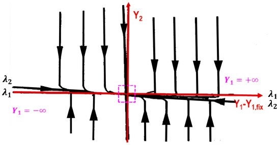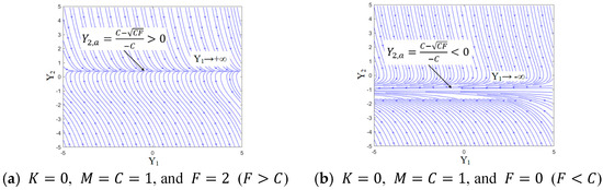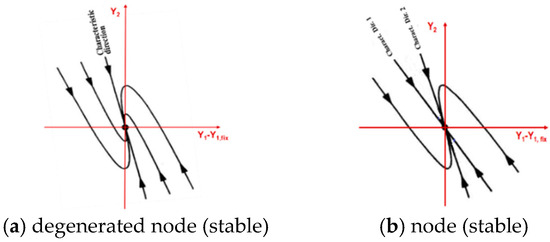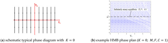 then the equilibrium point is a degenerate node (a node with only one characteristic direction). With the being either positive or negative, stability of the degenerate node depends on the sign of . The HMB dynamics phase diagram (an example with stable equilibrium) takes the form schematically as in Figure 5a.