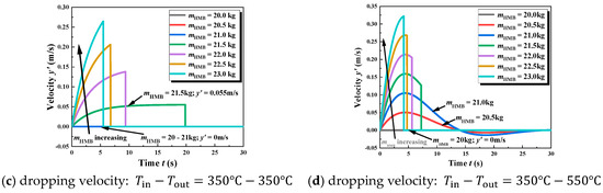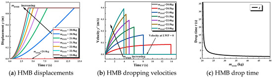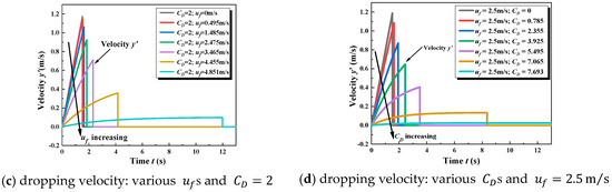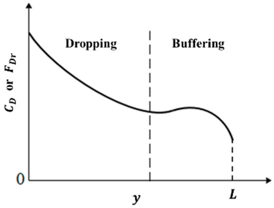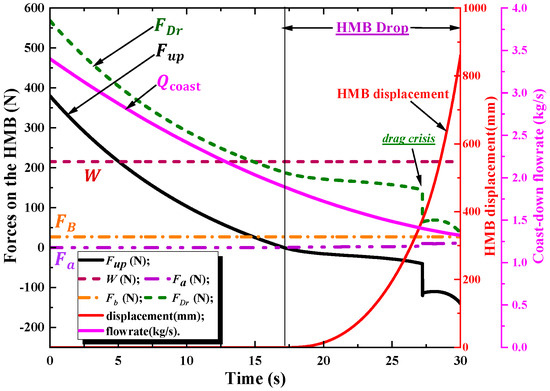 As the HMB drops, its increasing drop velocity results in an elevated relative velocity to surrounding fluid, which thereby tends to enhance the hydraulic thrust . Nevertheless, it seems that the reduction trend of due to the changing of flow paths and the descending of coast-down flow outweighs the limited contribution of increased . Consequently, continues to decrease with the HMB’s falling, yet the decreasing trend becomes significantly less steep. Although the added mass force increases from zero as dropping starts, its influence on the dropping motion seems negligible. Additionally, buoyancy is much smaller compared to gravity and hydraulic thrust, and is expected to have a relatively minor influence on dropping motion.