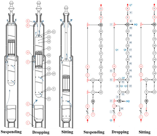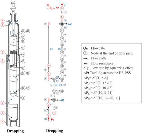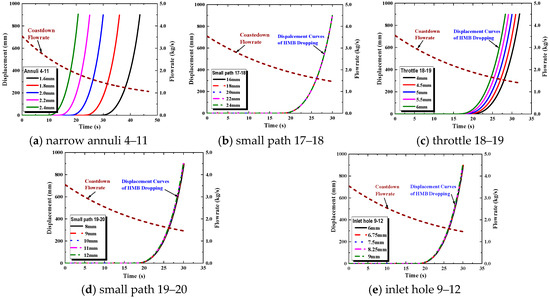 It is seen that alternations in certain key structural dimensions might significantly affect both critical flowrate and drop time, such as narrow annuli 4–11 and the internal throttle hole 18–19. As for the small paths 17–18 and 19–20, which are upstream and downstream the throttle hole, and the inlet hole 9–12, although they contribute to the overall pressure drop of the HS-PSS to a certain extent, their size variations exert a relatively minor influence on the dropping process. The effects of sensitivities of structural size on HMB dropping behavior (critical flowrate and drop time) are summarized in Figure 36.