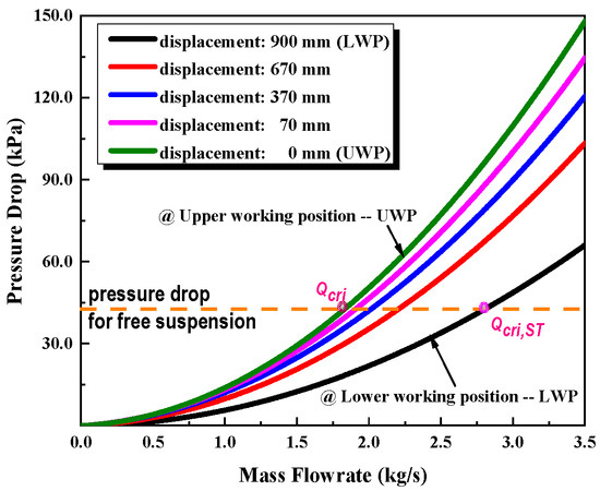 The equilibrium with the HMB statically suspending at any positions other than UWP and LWP is possible. In this case, the corresponding in Equation (21) is varied mainly for the sake of varied internal–external flow distribution of the HMB at different positions (refer to Figure 2). This adds to the complexity of the HMB suspension state. Fortunately, this suspension state is not necessarily required for both HS-PSS the design and working function.