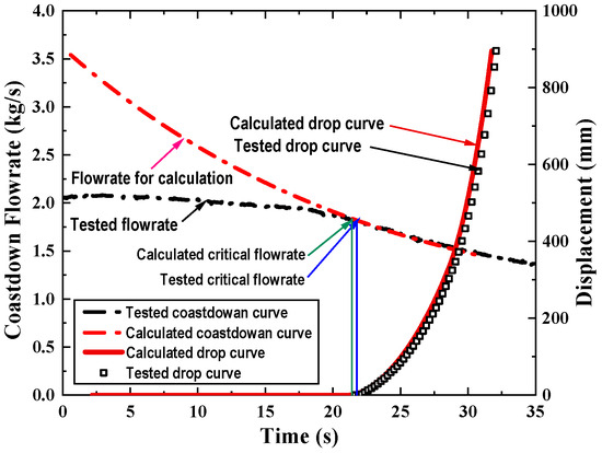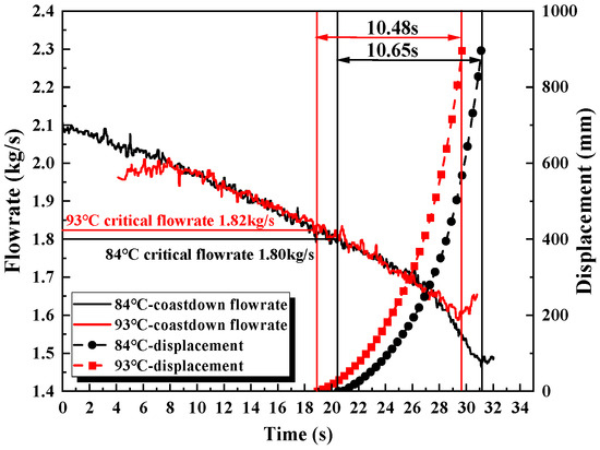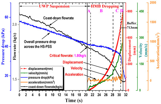 Furthermore, Figure 34 compares the HMB dropping curves across two different temperature conditions. As shown, there is a certain difference in HMB drop curve between the two temperature tests, but the difference is not significant. At , the HMB starts dropping when flowrate reaches about 1.80 kg/s, and the drop time is 10.65 s; at , the HMB begins to drop when the flowrate is about 1.82 kg/s, and the dropping takes 10.48 s. It needs to be stated that, the drop time of the HMB for water at is 10.65 s, which is extended to a time of 10.56 s for sodium at , and the functional requirements for drop time are met.