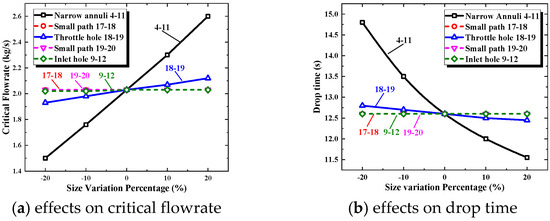 To search for information about geometrical effects on HMB dropping dynamics for design optimization, Figure 35 presents the sensitive results of size effect of some key flow structures in the HS-PSS (as structured in Figure 22) on HMB dropping. The key structures picked out for study include, as indicated in Figure 22, narrow annuli 4–11, small paths 17–18, 19–20, throttle 18–19, and inlet hole 9–12. For each flow path structure in the HS-PSS, with the related size of the present design as reference value, five sizes are selected: the reference value, and of the reference value. For the same coast-down flowrate, HMB dropping processes are simulated with PSSD code, and sensitivities of the structural dimension effects on starting point of HMB dropping (corresponding to the critical flowrate) as well as the drop time are examined.