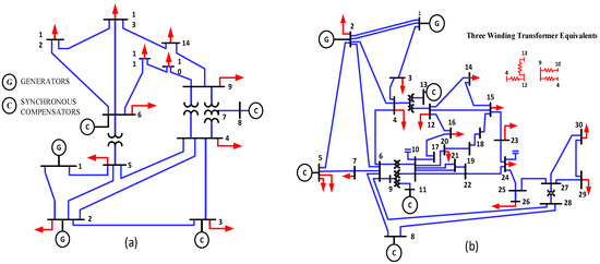 The proposed advanced energy management based on IEEE benchmark tested systems (a) IEEE 14-bus network and (b) IEEE 30-bus network.
