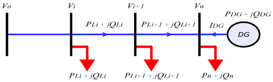After the integration of DG units, the total power loss PT(Loss) may be determined by modified equations as shown below (5), and the model shown in Figure 3.