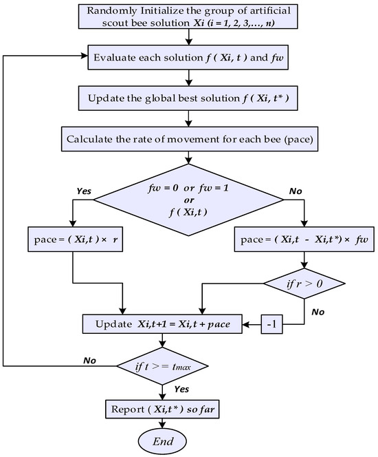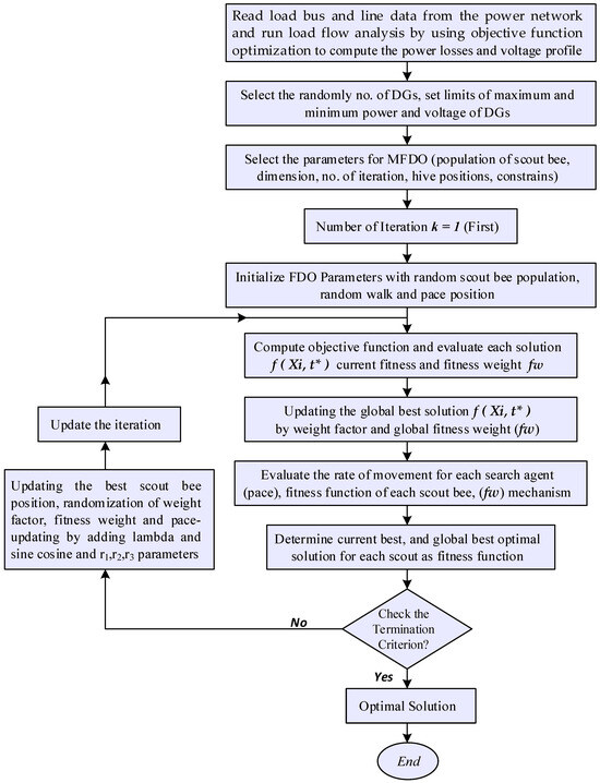 Therefore, in this research, a new computational intelligence (CI) optimization approach, called the hybrid Modified Fitness-Dependent Optimizer (MFDO), is proposed to optimize DG integration in the hybrid power network. The MFDO is employed for solving the DG “placement” and “sizing” optimization problems to minimize power losses, improve the voltage profile, and enhance power reliability and power quality in the distribution network (DN) [51]. The robustness of the MFDO technique in efficiently optimizing DN is a key factor in its selection. This technique has very satisfactory performance and takes minimum time to achieve the optimum solutions. Additionally, it is capable of solving complex optimization problems with low computational time, even for large power systems, and does so with a reduced number of iterations [52,53,54,55,56,57]. The MFDO has more competitive results as compared to other metaheuristic algorithms, making it applicable for solving a wide range of real-world engineering problems [58,59,60]. However, while the original FDO swarm intelligence technique is useful for optimization, it has certain limitations. Both FDO and IFDO demonstrate competitive performance, but they suffer from several key issues, including premature convergence, poor exploitation, an imbalance of exploitation and exploration, a slow convergence rate, and insufficient memory allocation. Consequently, modifications to the FDO are introduced to resolve the FDO and IFDO issues such as premature convergence, the slow convergence rate, poor exploitability, insufficient memory allocation, prediction accuracy, and refining solutions. The modified FDO (MFDO) optimization technique is more efficient, and robust, which is an enhanced version of original the FDO. It incorporates improvements such as a modified weight factor, pace updating mechanism, fitness weight adjustment, and optimized hive and scout bee position and velocity values to resolve the FDO and IFDO issues, thereby increasing prediction accuracy and solution precision. The MFDO enhances the exploration and exploitation capabilities; it can be readily constrained into local optima, converges more quickly, and performs better than FDO and IFDO algorithms. This makes it well suited for solving complex problems and providing optimal solutions.
