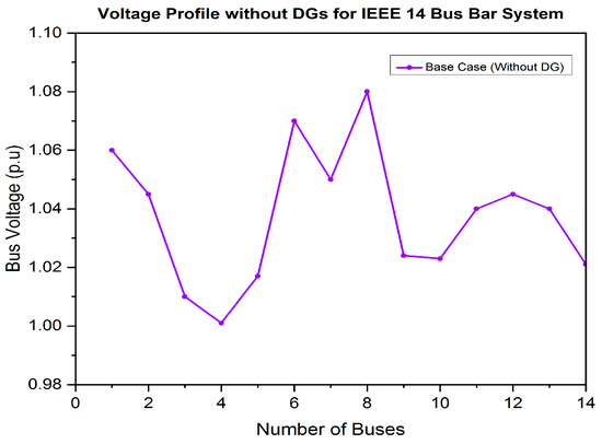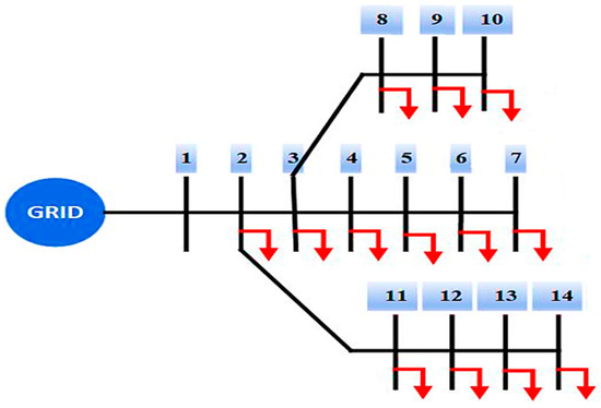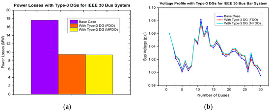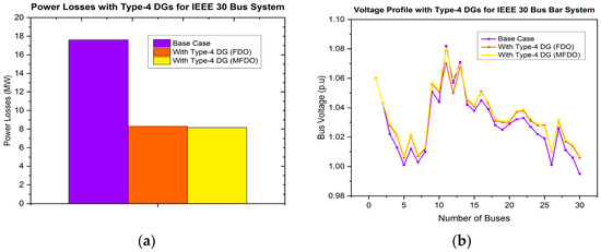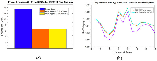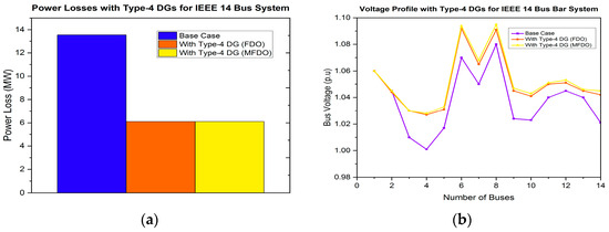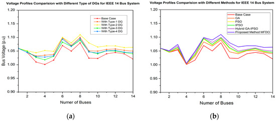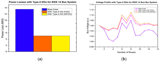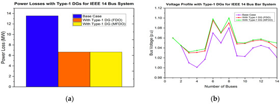In this research work, the power distribution network (DN) is optimized using the proposed control strategy in conjunction with the MFDO technique. This approach effectively minimizes the power losses and improves the system’s voltage profile by integrating various types of DG, including type-1, type-2, type-3, and type-4. This is also capable of finding optimal sizes and locations for integrating single or multiple DG units, within non-uniformly and heavily overloaded distribution networks [61,62,63]. To identify the best positions for DG allocation, several multi-objective functions are considered essential in this work. The proposed method has been successfully implemented under conditions of randomly connected, and heavily varying loads at low power factor (PF) levels, and accommodating both single and multiple DG units. Additionally, the performance of the proposed method is compared with other techniques, to verify its validity and effectiveness. To evaluate its validity and effectiveness, the IEEE 14-bus and 30-bus test systems have been considered as a case study.