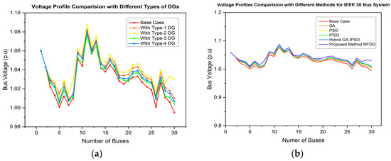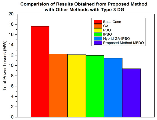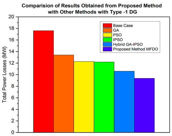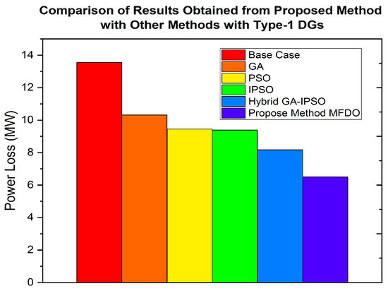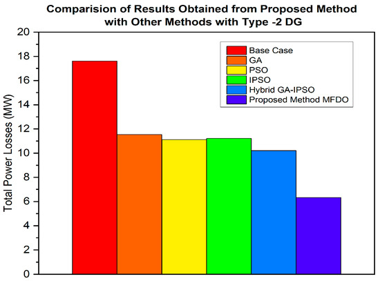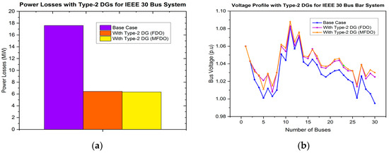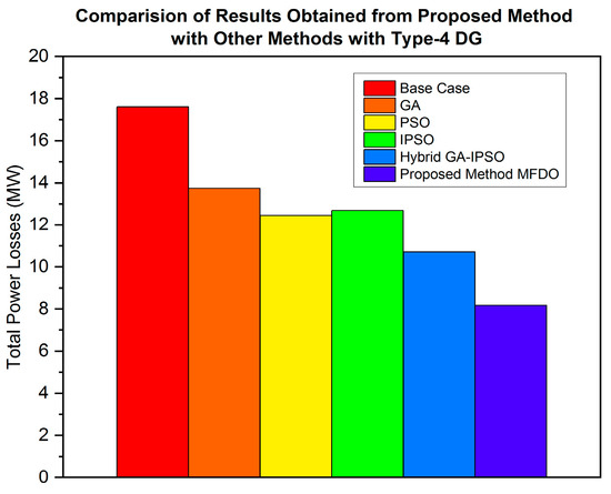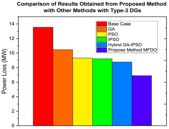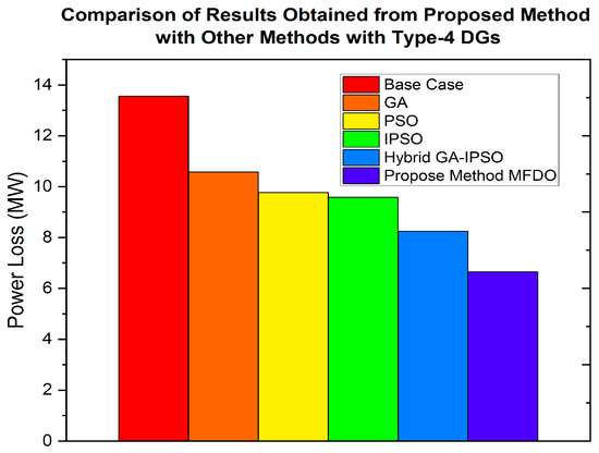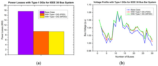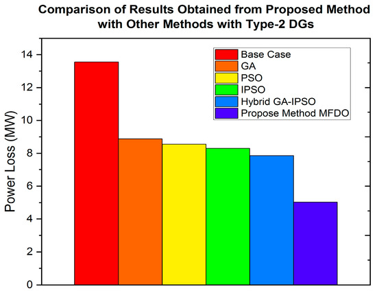 - The power distribution network (DN) is optimized using the proposed hybrid MFDO technique, which effectively minimizes power losses and improves the voltage profile by integrating different types of DG, including type-1, type-2, type-3, and type-4.