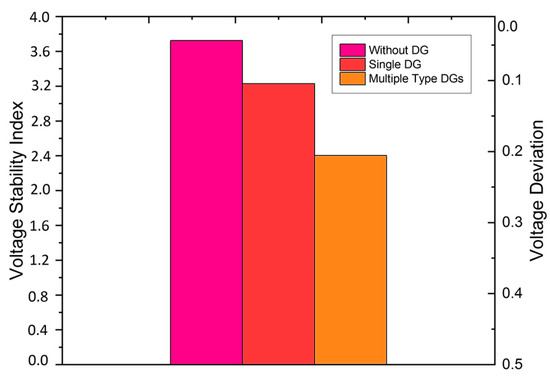 Power stability improvement (PSI) is defined to see the impacts of DG on power stability. Power stability is calculated by using Equation (28):