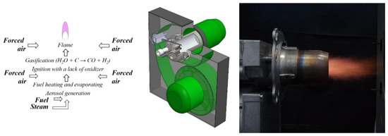 The ignition stability and completeness of combustion of liquid hydrocarbons are determined by their quality of atomization and mixing, as well as by processes of fuel gasification [4]. These factors are essential when burning low-quality fuel residues that are characterized by a high water content, the presence of mechanical impurities, and a high viscosity [5]. In such conditions, pre-gasification is the most suitable solution to produce combustible gasses [6]. Pre-pyrolysis [7] is mainly used for light fuels, such as in devices [8,9,10,11,12]; it is not used for heavy fuels due to the risk of coke deposition [13].