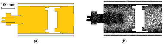 Figure 2 shows the central section of the burner and boiler volume. The calculations were carried out in the Academic version Ansys Fluent 17.1 package on an unstructured polyhedral grid of 5.4 million cells (Figure 2) with condensation in the area where the processes of the evaporation, ignition, and combustion of fuel are intensively occurring (the flame formation zone); additionally, a discrete droplet size distribution (typical for injectors) and the spray angle of the dispersed jet were set.