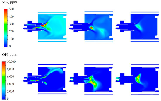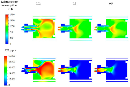Numerical simulation was performed for modes with a fuel consumption of 3.0 kg/h and an excess air coefficient of 1.35. Relative steam consumption varied from 0.02 to 0.5, similar to the modes studied in [38]. The results of numerical modeling showed that the relative steam consumption had a significant effect on temperature and concentration distributions of substances. At low values, the flame became more stretched, while at higher values, it was localized near the burner nozzle due to the more intense oxidation of the fuel inside the gas generation chamber of the burner. With decreasing relative steam consumption, NOx and CO concentrations increased, affecting their content in the final combustion products, and increasing the underburning of the fuel (see Figure 3 and Table 1). In [40], it was noted that adding steam significantly affected the intensity of certain processes in the combustion chamber. For example, the decomposition of high-molecular-weight hydrocarbons—C7H16 + H = C7H15 + H2 and C7H15 = C2H5 + C2H4 + C3H6—slows down, and the production of reaction products involving the OH radical significantly increases.