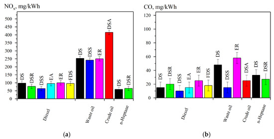Indicators of (a) nitrogen oxides and (b) carbon monoxide in combustion products for FDS and atmospheric burner devices (Section 3.2, according to Table 2).