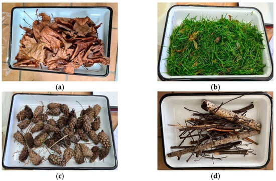 Photos of the tested GW fractions: (a) leaves, (b) grass, (c) cones, (d) branches.