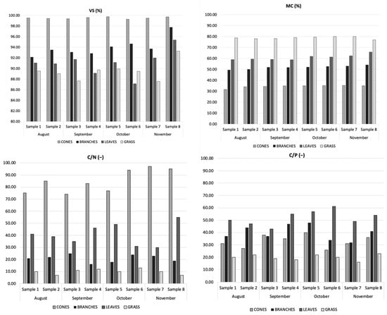 Conversely, Zeller et al. [67] posit that the proportion of grass and leaves in green waste is 35%. Conversely, the tested cones exhibited the highest VS and C/N content, while grass demonstrated the lowest C/N ratio (Figure 2). In the paper by Almedros et al. [68], the authors indicated that the VS for cones was 74.85%, and the C/N ratio was 173. In contrast, the study by Herman et al. [69] indicated that the C/N value for grasses ranged from 18 to 35.1. These variations in the chemical composition of green waste components underscore the importance of understanding their distinct properties, which are crucial for optimizing sustainable GW management practices. Some authors [4] recommend separate collection and recycling of the green and brown parts. Further, GW research should be conducted with division into at least two such factions.