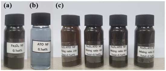 Manufactured nanofluids: (a) 0.1 wt% Fe3O4 NF, (b) 0.1 wt% ATO NF, (c) Fe3O4/ATO nanofluids.