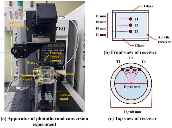 The photothermal conversion experiment involves a heating phase, where the nanofluid is exposed to light for 2.5 h, followed by a cooling phase lasting 0.5 h to measure the heat loss coefficient. During the cooling phase, the light source is turned off after the nanofluid reaches its equilibrium temperature under light exposure, allowing the heat dissipation rate from the receiver to be evaluated. The data gathered during the experiment were recorded at 1 s intervals using a data logger (MX-100, Yokogawa Inc., Tokyo, Japan).