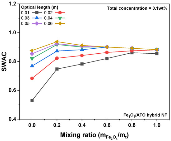 The Fe3O4/ATO hybrid nanofluids demonstrated enhanced solar-weighted absorption coefficients relative to both Fe3O4 and ATO nanofluids. At an optical path length of 0.01 m, the solar-weighted absorption coefficient of the Fe3O4/ATO hybrid nanofluid (where = 0.8) was 0.861, indicating a slight improvement over the coefficients of 0.854 for the 0.1 wt% Fe3O4 NF and 0.529 for the 0.1 wt% ATO NF. However, at an optical path length of 0.06 m, the solar-weighted absorption coefficient of the Fe3O4/ATO hybrid nanofluid (where = 0.2) increased from 0.748 to 0.938. As the optical path length extended from 0.01 m to 0.06 m, the optimal for maximizing the solar-weighted absorption coefficient gradually decreased. These findings suggest that, with an increase in optical path length, enhancing optical absorbance and suppressing scattering reflection are crucial for the performance of Fe3O4/ATO hybrid nanofluids.