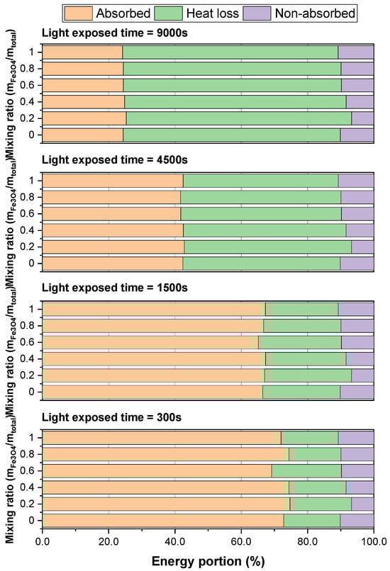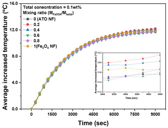 The photothermal conversion performance of nanofluids is a critical parameter that directly influences the solar radiation harvesting efficiency of direct absorption solar collectors. This performance is affected by several factors, including the optical absorbance of the nanofluid, the fluid temperature, and the optical path length of the containment vessel. Figure 6 presents the temperature variation of 0.1 wt% Fe3O4/ATO nanofluids over time under solar-radiation exposure. The results indicate that the temperature of the 0.1 wt% Fe3O4/ATO nanofluids increases progressively with prolonged exposure to solar radiation, demonstrating the effective conversion and storage of solar energy into thermal energy. Over an exposure period of 9000 s, the nanofluid with = 0.2 exhibited the highest temperature increase, reaching 12.2 °C. In contrast, the nanofluid with = 0.6 showed the lowest temperature increase of 11.7 °C, a result that is comparable to the temperature increase observed for the ATO nanofluid.