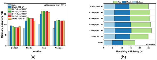 Figure 8 shows the temperature increase and local collection efficiency of the nanofluids after 9000 s of solar exposure. The temperature distribution within the receiver is primarily influenced by the solar energy absorption characteristics of the nanofluids. Both water and nanofluids exhibited higher energy storage in the upper section of the receiver, attributed to the concentration of absorbed thermal energy in this region. The average temperature increases and receiving efficiency for water were observed to be 8.16 °C (= 10.3 °C, = 8.4 °C, = 7 °C) and 17.5% (= 7.02%, = 5.73%, = 4.77%), respectively. The single-component nanofluids, specifically 0.1 wt% Fe3O4 and 0.1 wt% ATO, demonstrated enhanced solar energy absorption capabilities compared to water, resulting in elevated temperature increases and receiving efficiencies. The 0.1 wt% Fe3O4 nanofluid achieved an average temperature increase of 11.8 °C (= 15.8 °C, = 11.7 °C, = 9.1 °C) and a receiving efficiency of 25% (= 10.8%, = 8%, = 6.2%), indicating that the primary absorption of solar radiation occurred predominantly in the upper region. In contrast, the 0.1 wt% ATO nanofluid exhibited an average temperature increase of 11.7 °C (= 15.1 °C, = 11.8 °C, = 9.5 °C) and a receiving efficiency of 24.82% (= 10.2%, = 8.05%, = 6.48%), demonstrating its capacity to absorb solar energy more evenly across the receiver, including the lower regions.