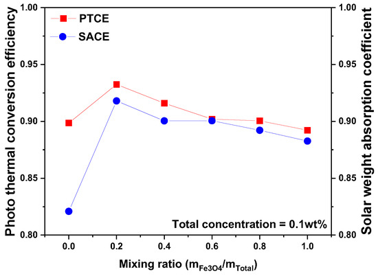 Figure 9 shows the photothermal conversion efficiency and the solar-weighted absorption coefficient of 0.1 wt% Fe3O4/ATO hybrid nanofluids as a function of at an optical path length of 0.04 m. The photothermal conversion efficiency of the 0.1 wt% Fe3O4/ATO hybrid nanofluid reached its peak value of 0.932 at = 0.2. Beyond this ratio, a decline in photothermal conversion efficiency was observed. This trend is consistent with the behavior of the solar-weighted absorption coefficient, which also attained its maximum value of 0.918 at = 0.2 and subsequently decreased.