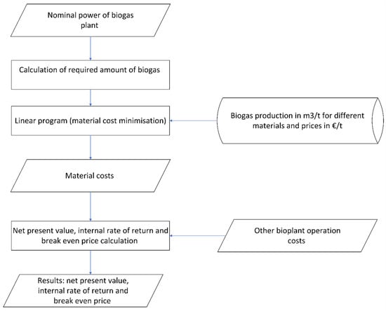 We used a linear program to calculate the required amount of slurry and other materials, minimizing the costs of the mixture. The main constraint is the required amount of biogas (Equation (1)). The linear program was employed to calculate the required amounts of various materials needed to ensure the desired level of biogas production. This ensured that the material inputs were balanced in a way that maximized biogas output while minimizing costs of input materials. The resulting data on material quantities were subsequently used in the consequent feasibility study, where they played a key role in assessing the economic and practical viability of the biogas production process. Additionally, we utilized reference values from the established literature [27], which provide estimates of biogas yield per ton of source material, to inform our calculations. These values served as a benchmark, helping us to accurately estimate the potential biogas output based on the types and quantities of materials used. Optimization (calculations) was conducted in What’s Best Industrial, which runs in a spreadsheet environment, making it easy to combine the results with spreadsheet models used for economic/investment analysis.