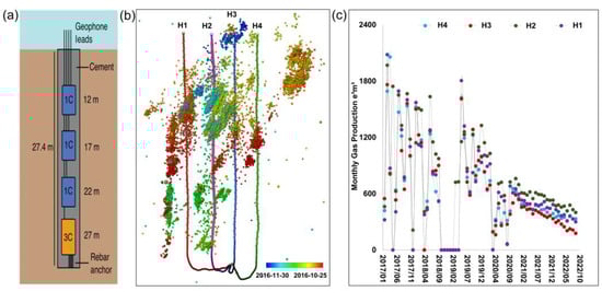 HF wells’ microseismicity monitoring and production history. (a) Burial broadband seismometers [15]. (b) Microseismicity events that occurred from 25 October to 15 December 2016 [19], monitored by seismology monitoring stations and colored according to time. (c) Monthly shale gas production of the four HF wells.