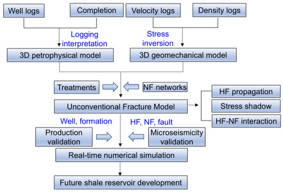Nevertheless, the efficient and economic development of shale resources presents significant hurdles for the petroleum industry, primarily due to an intricate distribution of shale sweet spots and the substantial expenses associated with drilling and fracturing horizontal wells [8]. Numerous investigations have been undertaken to delineate the properties of shale reservoirs and forecast the output of shale formations. Some researchers combined the advantages of multicontinuum and discrete fracture/matrix (DFM) representations to adequately capture the effects of the multiscaled fracture system [9,10]. The findings of previous studies have indicated that the development of shale reservoirs is influenced by various elements, including reservoir petrophysics, geomechanics, and the occurrence of natural fractures and faults [11]. Hence, in order to accurately describe a shale reservoir, it is important to include many aspects of reservoir quality, such as petrophysics, geomechanics, and the presence of natural fractures and faults, during a study process [12,13]. However, limited scholarly investigations have been undertaken to integrate both a geologic study and engineering applications. Hence, it is imperative to use an integrated methodology to comprehensively characterize shale reservoirs and effectively facilitate their efficient and cost-effective exploitation.