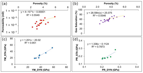 Petrophysics and geomechanics measurements of the key well and their relationships. (a) Relationships between porosity and permeability. (b) Relationships between porosity and gas saturation. (c) Relationships between dynamic and static Young’s modulus. (d) Relationships between dynamic and static Poisson’s ratio.