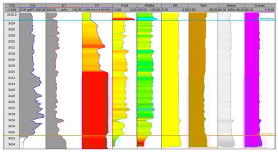 Petrophysics and geomechanics features of the key well within the Duvernay formation. GR = gamma ray, API. DT = acoustic, µs/m. RT = formation resistivity, Ω.m. POR = porosity. Perm = permeability, mD. PR = Poisson’s ratio. YME = Young’s modulus, GPa. Shmin = minimum principal stress, MPa. SHmax = maximum principal stress, MPa.