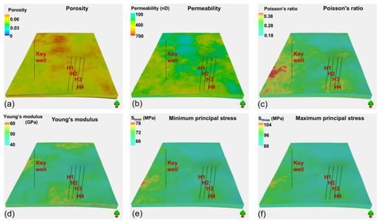 Petrophysical and geomechanical models based on the experiment results and well-logging interpretation. (a–f) Porosity, permeability, Poisson’s ratio, Young’s modulus, minimum principal stress, and maximum principal stress models. The base map also shows the location of the key well and four horizontal wells. The green arrow represents the north direction.