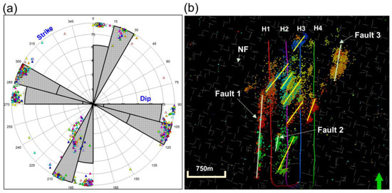 (2) The pre-existing natural fractures in the studied area were shown to have been influenced by two distinct tectonic events, resulting in the development of fractures with average dip azimuths of NE15° and SE285°, respectively. Based on the pattern of microseismicity, three pre-existing faults have been discovered.
