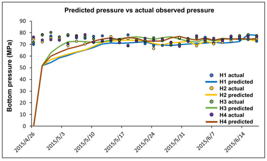 The comparison between the predicted bottom pressure and the actual observed one of four horizontal wells. The solid line represents the predicted bottom pressure based on the numerical simulations, while the circles denote the observed bottom pressure in the studied region.