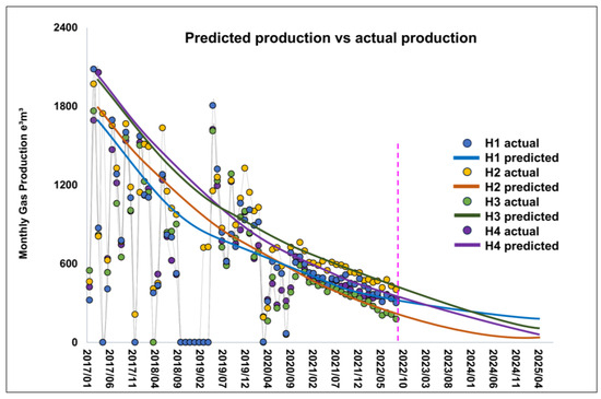 The production history matching of four horizontal wells. The circle lines represent the actual production of the four horizontal wells. The pink dashed line shows the end date of collected production data (2022/10).