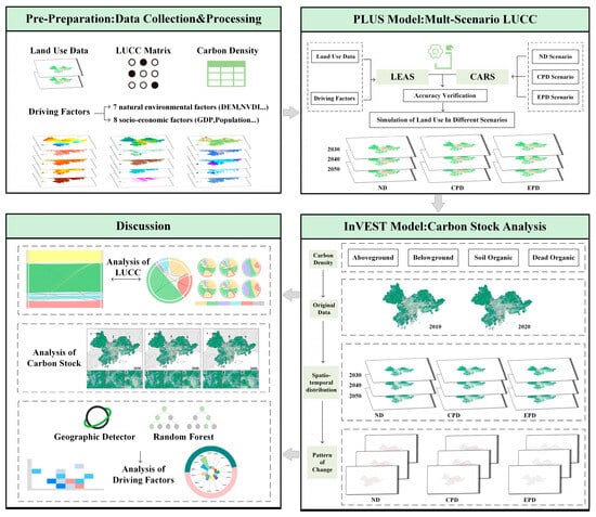 The integration of the PLUS and InVEST models overcomes their individual limitations, such as the PLUS model’s lack of carbon storage calculations and the InVEST model’s dependence on multiyear land use data. This approach also enhances the prediction of future land carbon storage dynamics, thereby offering valuable decision-making support for sustainable urban development [31,32]. However, several research gaps remain in the current literature that warrant further investigation. First, current research utilizing the PLUS-InVEST model predominantly focuses on individual provinces or cities, which indicates the need for a more thorough examination of spatiotemporal heterogeneity across urban agglomerations. Second, existing studies have predominantly focused on analyzing and forecasting the patterns of land use and land cover change (LUCC) and carbon storage variations, while the underlying drivers of these changes are poorly understood.