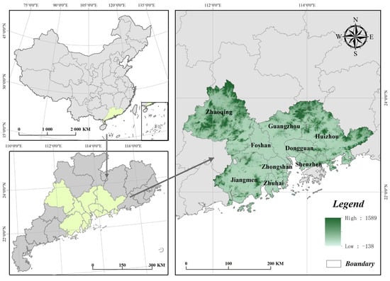 The PRDUA is situated in the south-central region of Guangdong Province, China, spanning latitudes 20°13′ to 25°31′ N and longitudes 109°39′ E to 117°19′ E. It encompasses a total area of approximately 56,000 km2 and includes nine cities: Guangzhou, Shenzhen, Foshan, Dongguan, Huizhou, Zhuhai, Zhongshan, Jiangmen, and Zhaoqing (Figure 2). The PRDUA is recognized as one of the most economically vibrant, densely inhabited, and industrially concentrated areas of China. It is characterized by a humid subtropical climate with well-defined seasons, including hot, humid summers and mild, dry winters. The region receives an average annual precipitation of 1600–2300 mm and maintains an average annual temperature range of 21.4–22.4 °C. Its average population is approximately 1,000,000, with some cities having more than 3,000,000 residents.