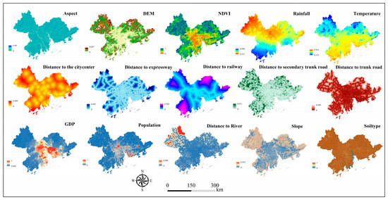To enhance the alignment between the predicted outcomes and real-world scenarios in the application of the PLUS model under multiple scenarios, 15 driving factors were incorporated, and they included seven natural environmental and eight socioeconomic factors. In this study, the selected driving factors were categorized into two main groups for analysis: socioeconomic and natural environmental. Socioeconomic factors such as population growth and GDP drive increased demand for residential and commercial land use, which, in turn, influences urban planning and shifts in land use types. These changes significantly impact land use patterns, ultimately affecting carbon storage. Moreover, interplay is observed between these factors. For instance, population size influences GDP growth and changes in socioeconomic factors lead to alterations in ecosystems, which in turn result in corresponding shifts in natural environmental factors. The classification of the data types and their sources is detailed in Table 4, with specific illustrations being provided in Figure 3. After resampling, a grid resolution of 30 m × 30 m was achieved using ArcMap.
