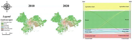 Using ArcGIS software (10.8.1), this study analyzed the land use transfer characteristics of the PRDUA region from 2010 to 2020. The results are presented in Table 6. From the perspective of the land use dynamic degree (hereinafter referred to as K), the PRDUA region primarily exhibited increases in construction land and grassland but showed significant declines in other land types, such as agricultural land, forest, water bodies, and unused land.
