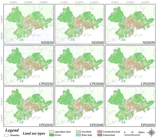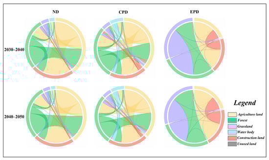 Land use change in the PRDUA was simulated for three scenarios (ND, CPD, and EPD) using 2030, 2040, and 2050 as temporal milestones with 10-year intervals, as illustrated in Figure 6 and Table 7. The transfers between land types under the three simulated scenarios are shown in Figure 7.