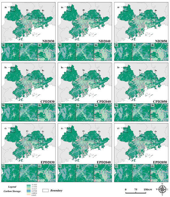 The PLUS and InVEST models were used to calculate the carbon storage outcomes for 2030, 2040, and 2050 under three distinct scenarios, as detailed in Table 8. Generally, carbon storage in the PRDUA exhibited a declining trend in both the ND and CPD scenarios, which implies that, if the prevailing development patterns are left unchecked or a development strategy that emphasizes urban primacy is pursued, the PRDUA would be confronted by the daunting prospect of significant “carbon loss”. Accordingly, realizing the goal of sustainable development and the target of “carbon neutrality” would be exceptionally difficult. Conversely, in the EPD scenario, the decline in agricultural and grassland areas was more moderate and complemented by a consistent increase in forest land, which collectively contributed to a stable carbon sequestration effect, thereby maintaining carbon storage stability within the urban agglomeration.